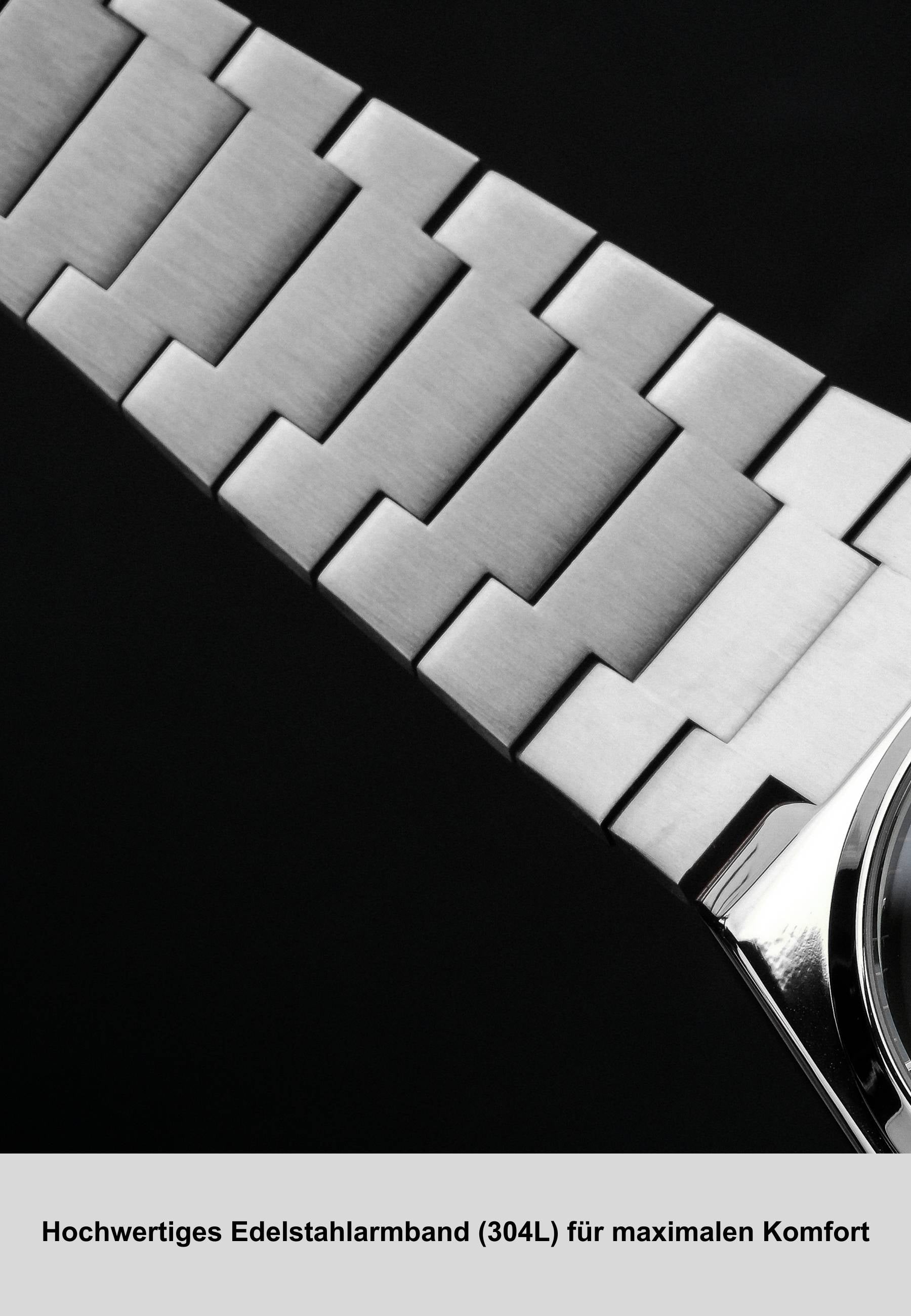 Wie gewohnt bietet sie ein 304L Edelstahlarmband (individuell anpassbar mit Werkzeug), ein SEIKO Quarzwerk für präzise Zeitmessung und Mineralglas zum Schutz des Zifferblatts.